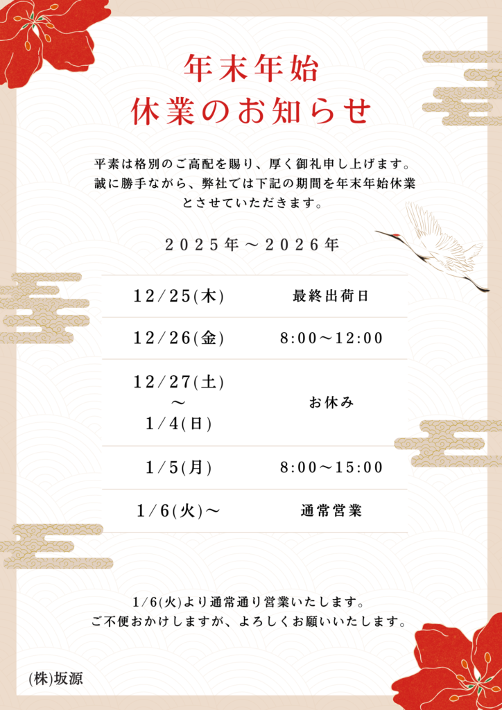 誠に勝手ながら弊社では、2025年12月26日(金)午後~2026年1月4日(日)までを年末年始休業期間とさせていただきます。