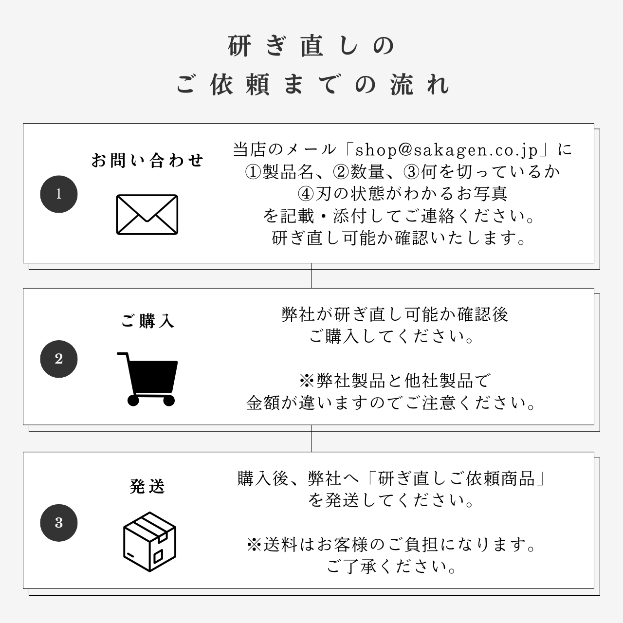 いつもご利用いただき、ありがとうございます。こちらは「研ぎ直しのご依頼(坂源製品)」のページです。